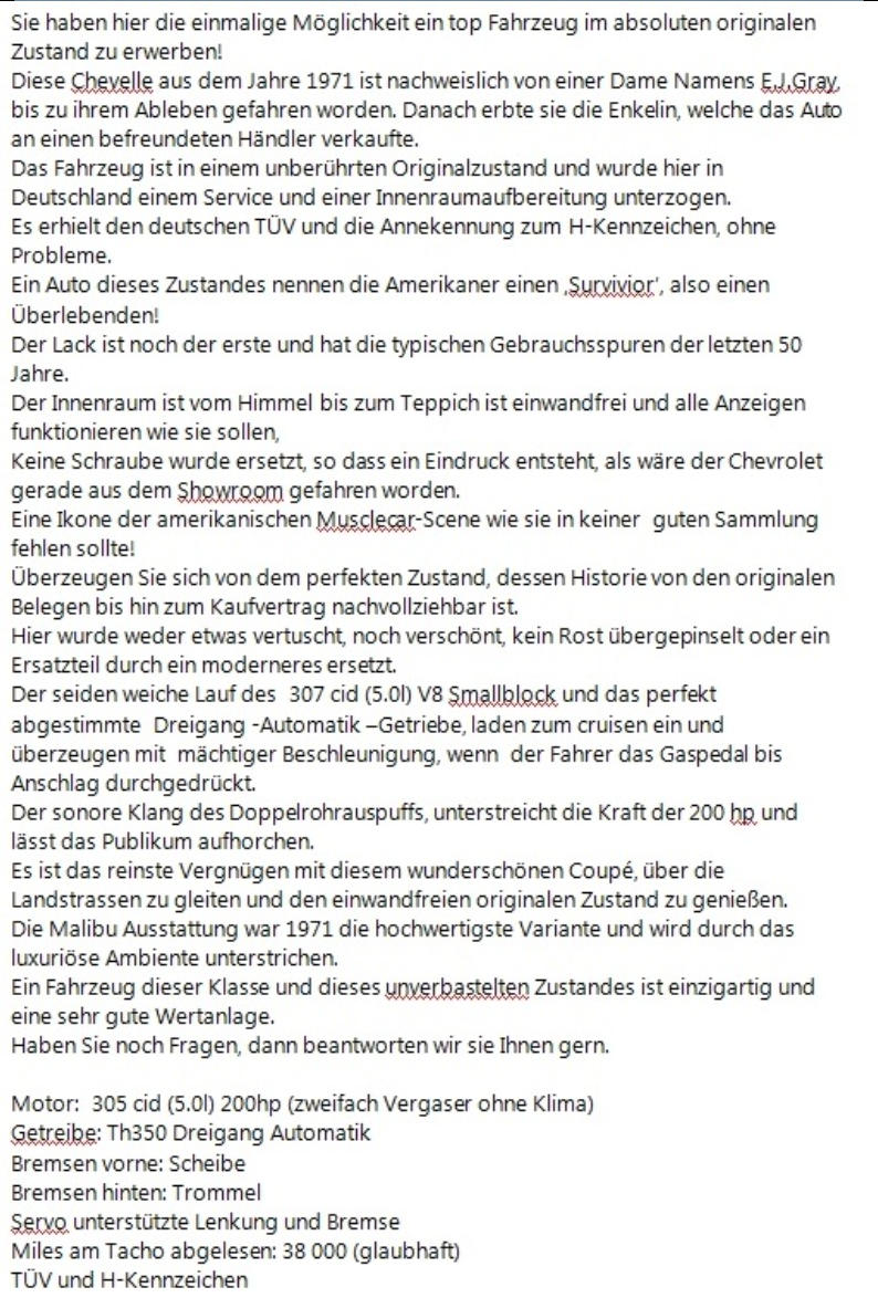 Das Wichtigste in Kürze:- TÜV neu und H-Gutachten- nachweislich 1te Hand (Historie vorhanden)- absoluter Originalzustand- ungeschweißt- original Lack- rostfrei- Interiör fast Auslieferungszustand- Automatik 3-Gang- Motor 305 cid / 5,0 l - erst 38t Meilen- genaueres entnehmen Sie bitte der Detailbeschreibung unten- VB 34.500,- €